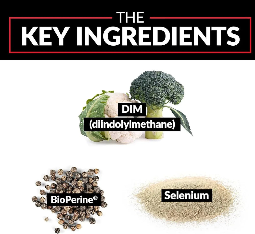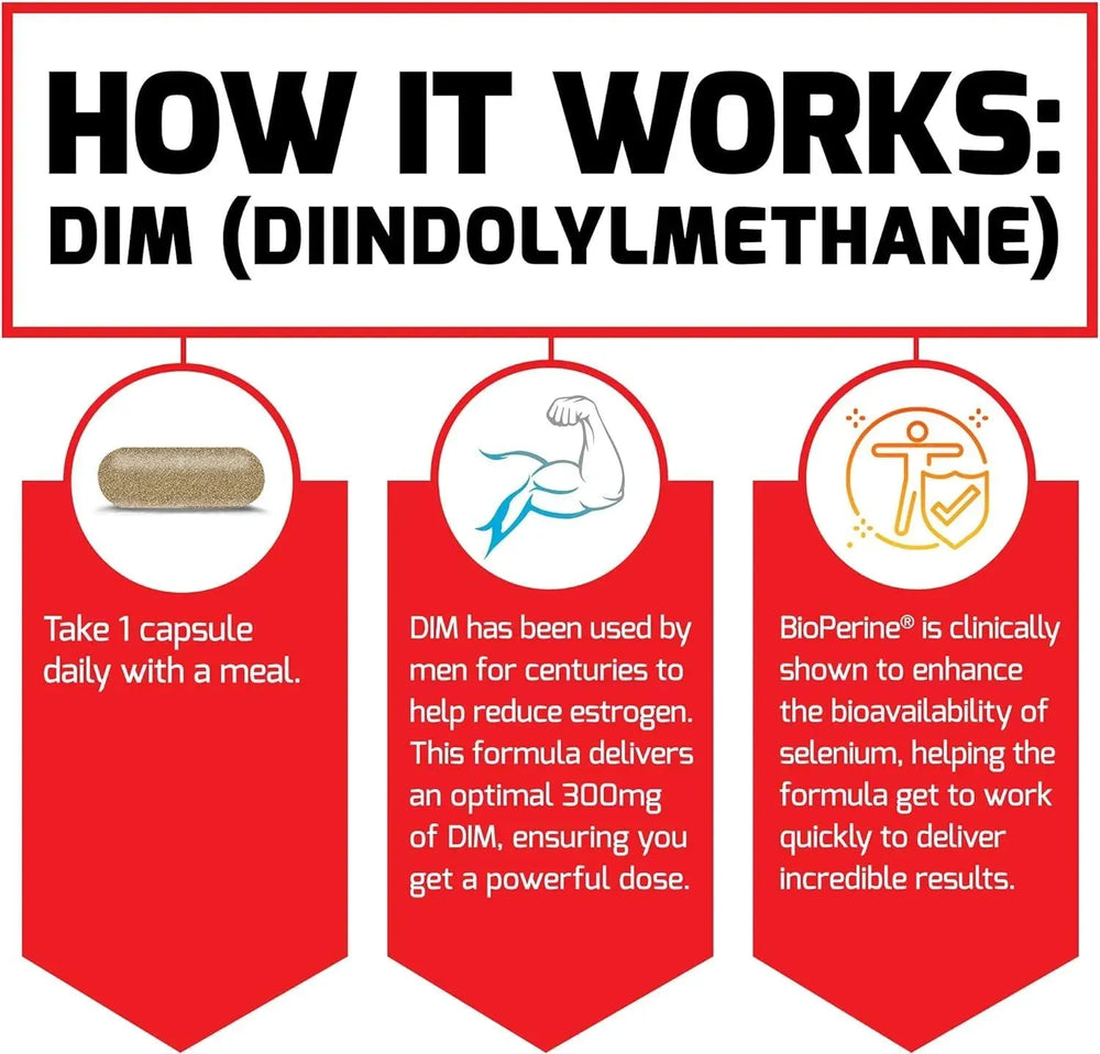DISMINUCIÓN DEL ESTRÓGENO: DIM, abreviatura de dindolimetano, es un compuesto único que se cree que ayuda a disminuir los niveles de estrógeno en los hombres. En cantidades concentradas, se cree que DIM actúa inhibiendo la enzima responsable de convertir la testosterona en estrógeno.