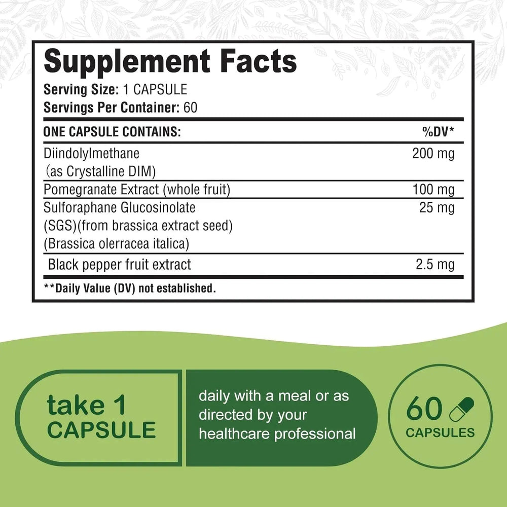 Extracto puro de plantas naturales. Su componente principal, el DIM, se extrae de las plantas crucíferas, mientras que el sulforafano se extrae del brócoli. No contiene ningún efecto secundario y al mismo tiempo promueve el equilibrio de estrógenos y el metabolismo de las grasas.