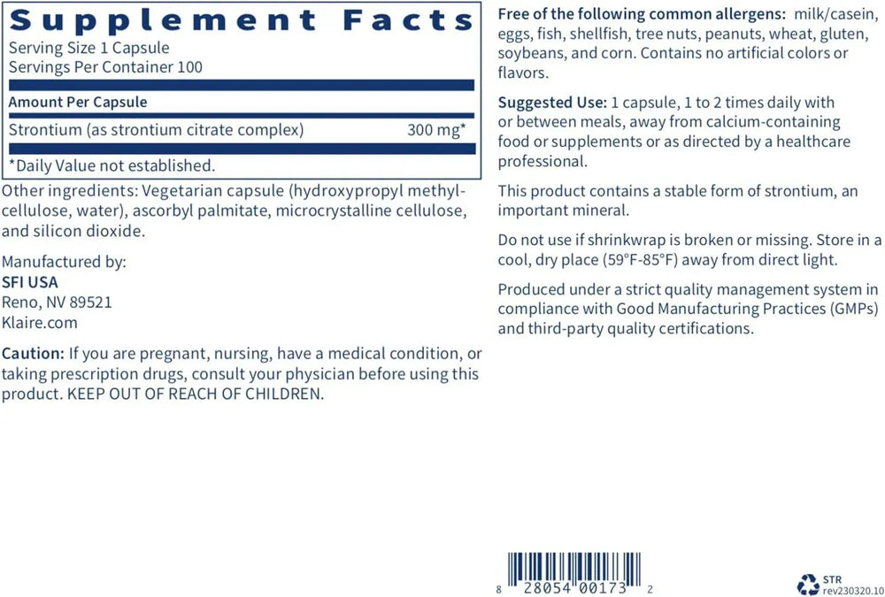 Klaire Labs Strontium 300Mg. 100 Capsulas