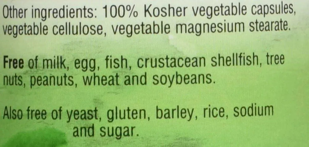 Sin leche, huevo, pescado, crustáceos, frutos secos, maní, trigo ni soja. Además libre de levadura, gluten, cebada, arroz, sodio y azúcar.