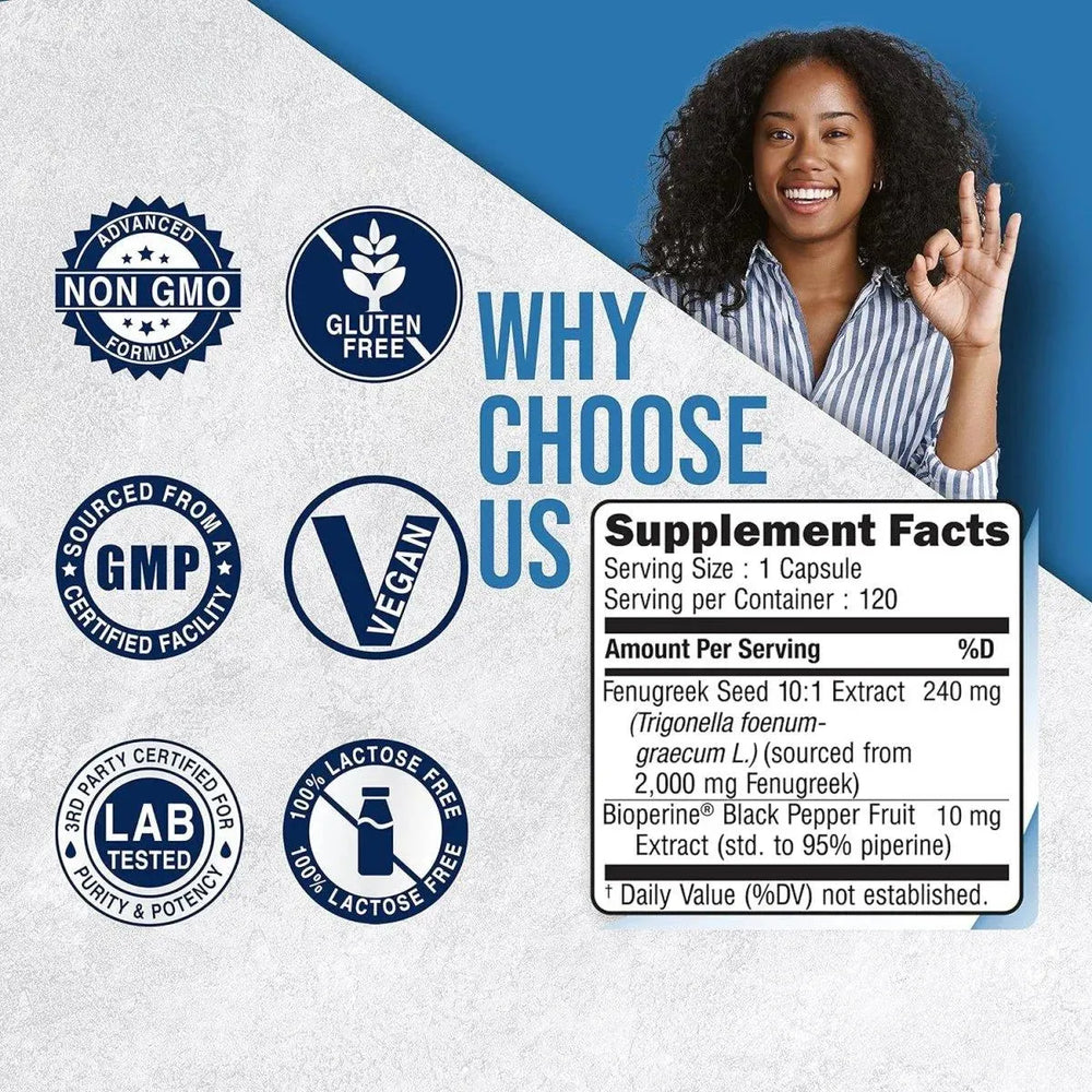 SUMINISTRO PARA 4 MESES: Contiene 120 cápsulas, cada una con 2410 mg de polvo de semilla de fenogreco y bioperina.