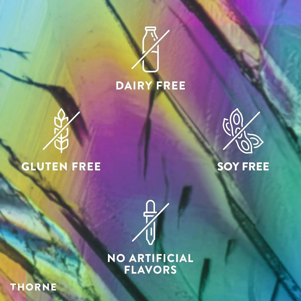 • Libre de: Cada producto Thorne está elaborado con los ingredientes más puros posibles, sin gluten ni otros alérgenos importantes (huevos, nueces, maní). Este producto tampoco contiene soja, lácteos, mariscos ni pescado.