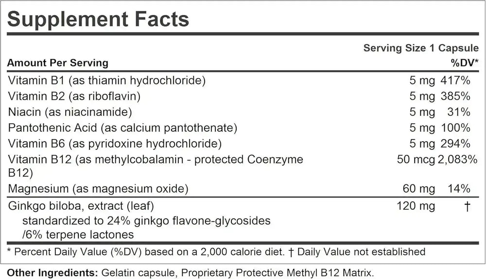 INGREDIENTES BIOACTIVOS PUROS SUPERIORES: proporciona 120 mg de ginkgo biloba estandarizado, complejo de vitamina B de alta potencia y magnesio. NO contiene leche, ni lácteos, ni gluten; NO contiene soja, levadura, maíz, trigo, sodio, sal, azúcar, grasa, colesterol, colorantes, conservantes, alérgenos comunes ni aditivos de fabricación.