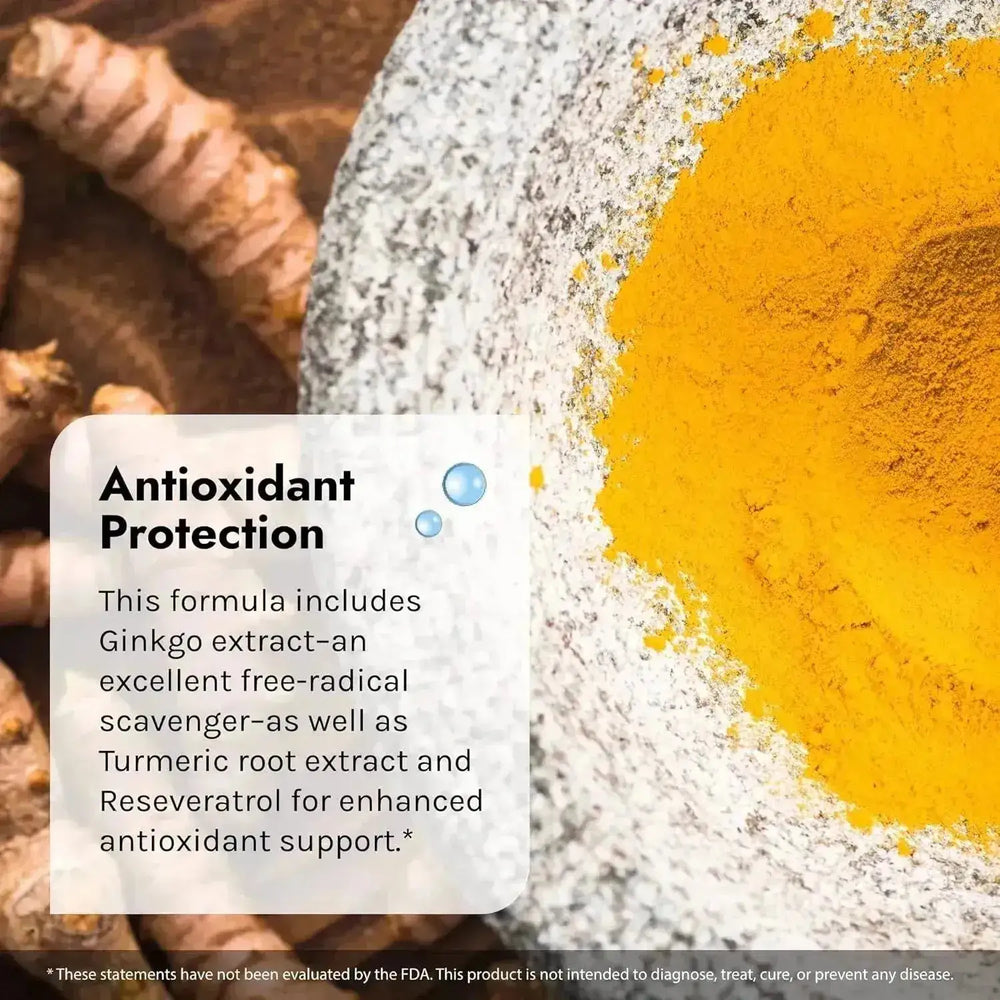 PODEROSO SOPORTE ANTIOXIDANTE: el extracto de ginkgo es conocido por ser un excelente eliminador de radicales libres en el cuerpo. Ampliando los efectos antioxidantes del ginkgo, esta fórmula incluye extracto de raíz de cúrcuma y resveratrol.
