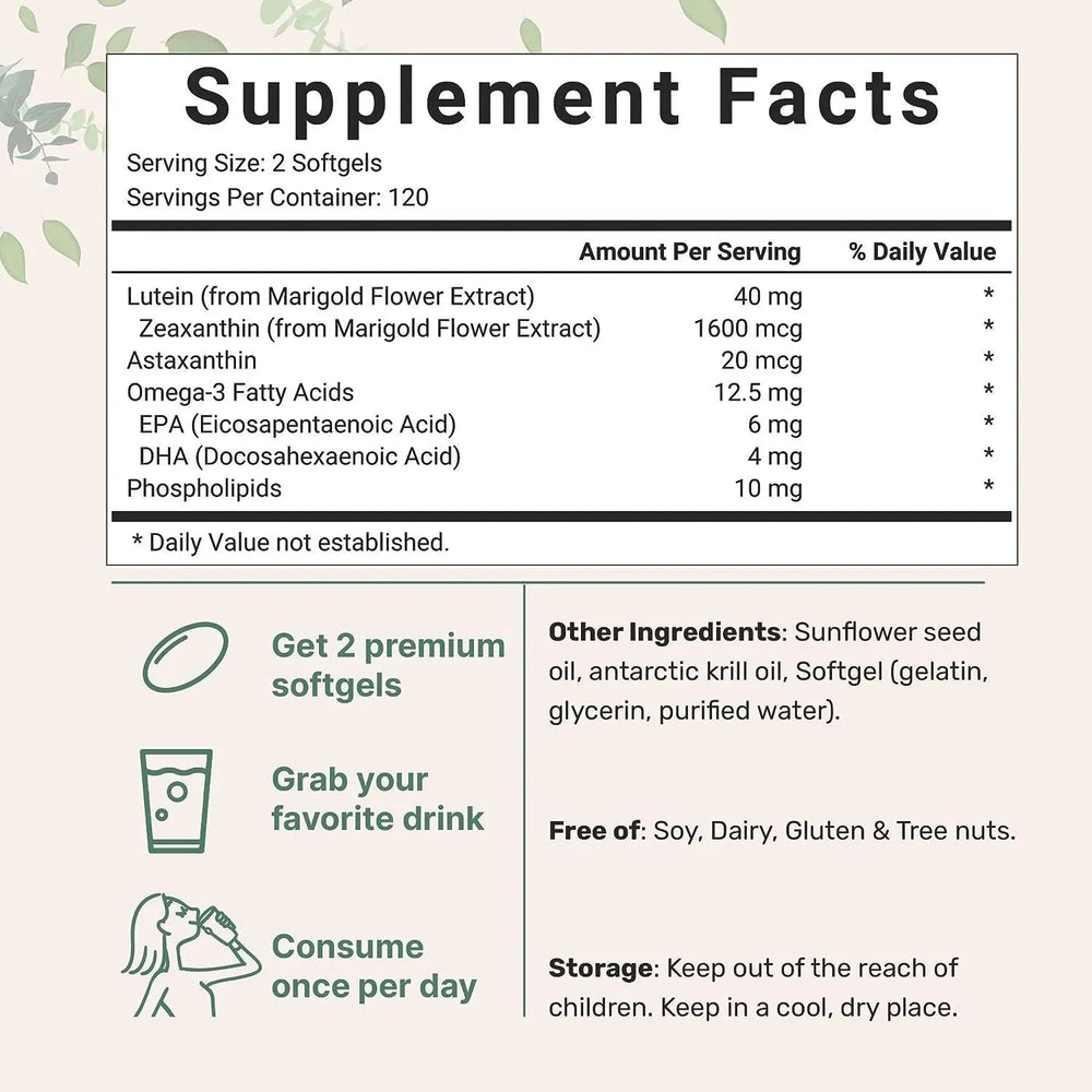 240 cápsulas blandas en total que proporcionan ingredientes de fácil absorción con una base de aceite de semilla de girasol virgen. Tamaño de porción de 2 cápsulas blandas que contiene 40 mg de luteína, 1600 mcg de zeaxantina, 20 mcg de astaxantina, 12,5 mg de ácidos grasos omega-3 y 10 mg de fosfolípidos.