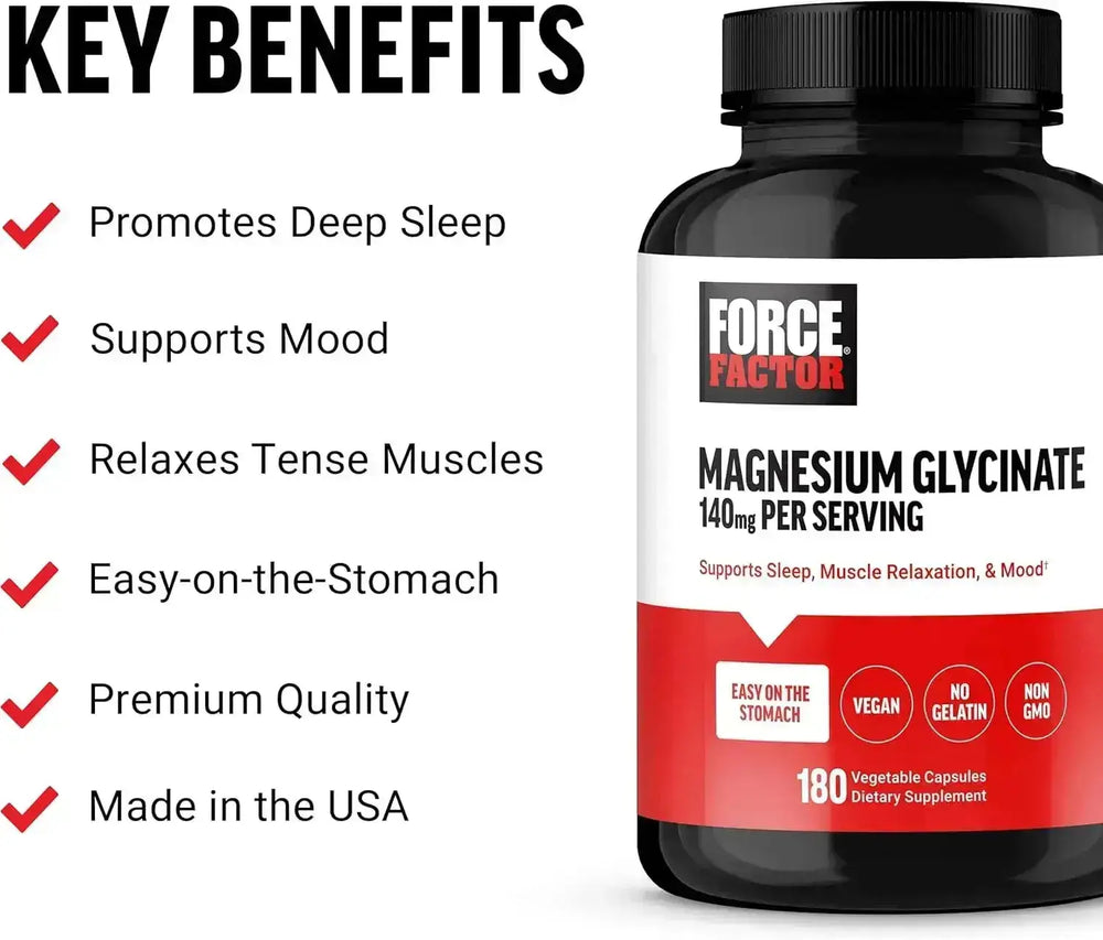 PROMUEVE UN SUEÑO REPARADOR: Las cápsulas de glicinato de magnesio Force Factor favorecen una mejor calidad del sueño, lo que le ayuda a despertarse renovado y rejuvenecido cada día.