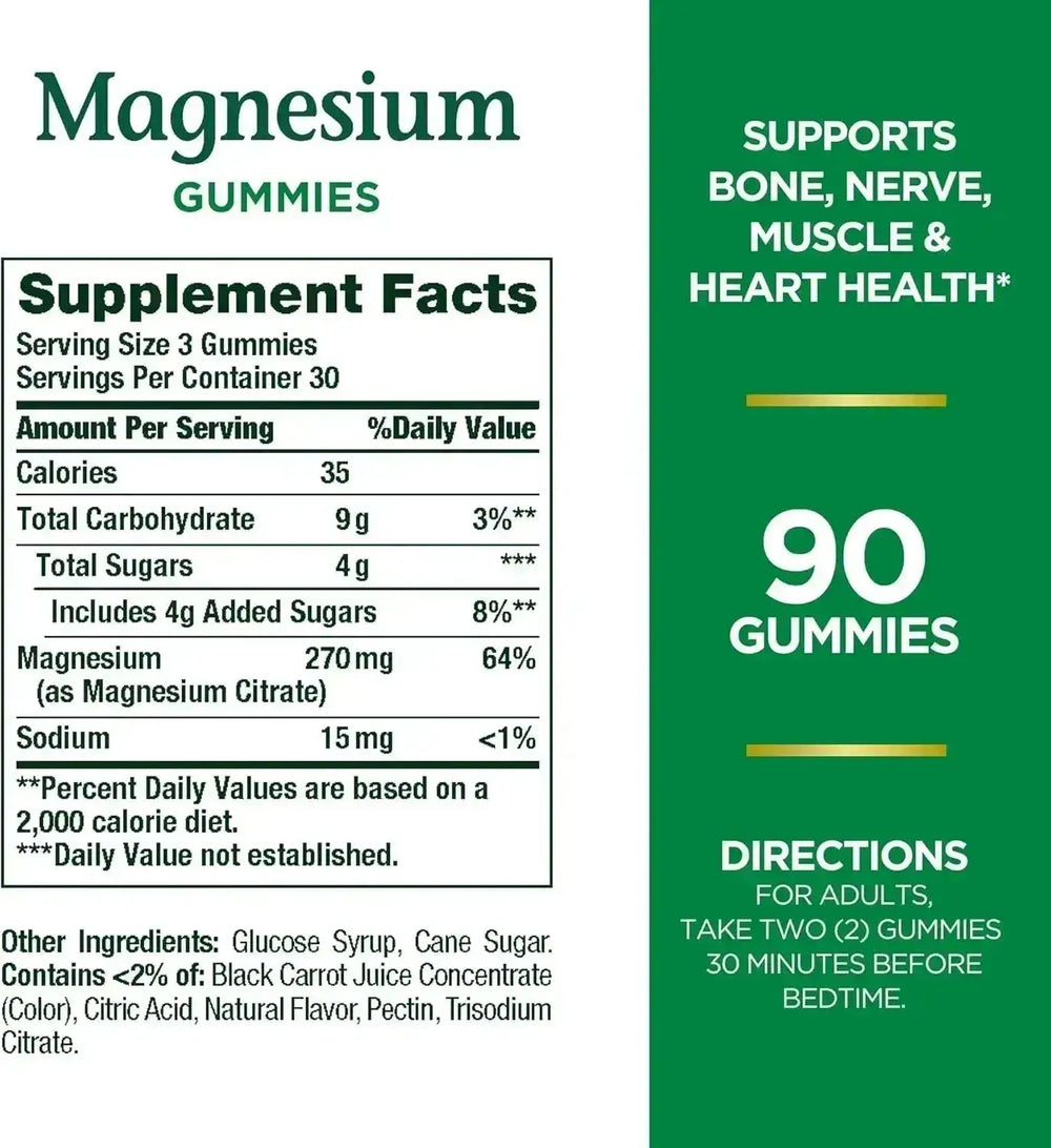 CON CITRATO DE MAGNESIO: Cada porción de tres gomitas contiene 270 mg de esta forma de magnesio altamente absorbible para ayudarte a obtener los mayores beneficios de tu suplemento diario de magnesio; los adultos toman tres gomitas 30 minutos antes de acostarse