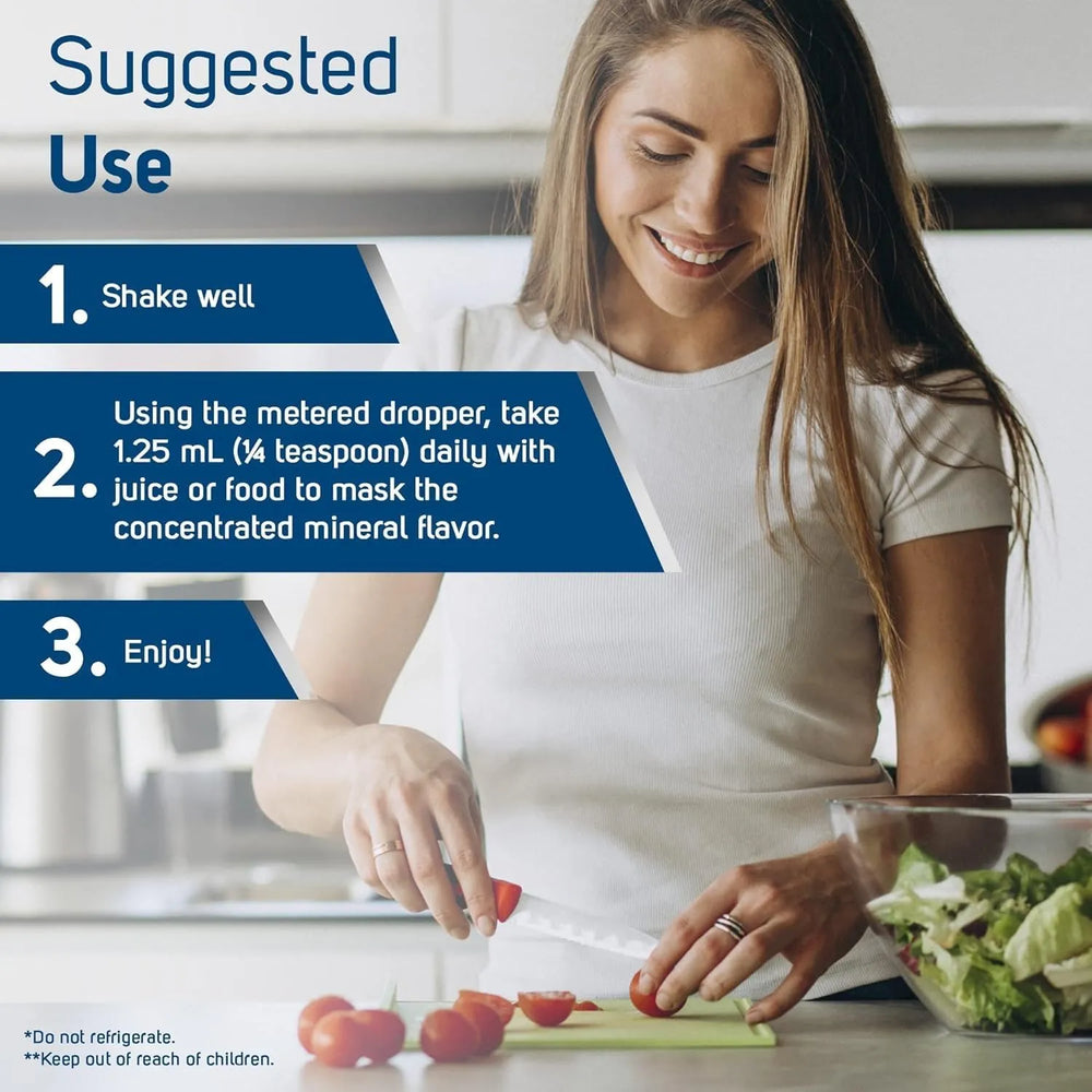 Suplemento de vitalidad celular: para favorecer la salud ósea y celular, agite bien y tome 1,25 ml al día con jugo o comida para enmascarar el sabor mineral concentrado; no refrigere