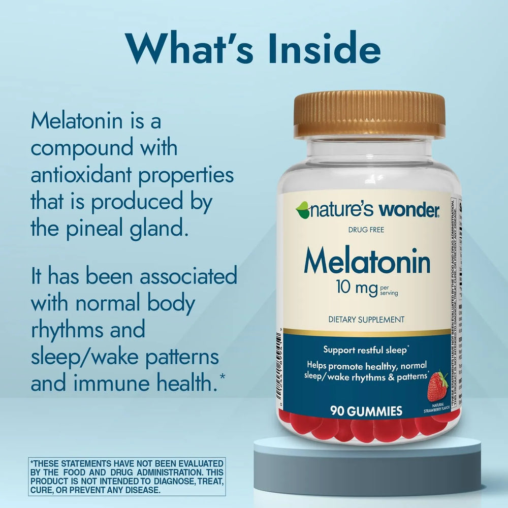 Apoye su sueño de forma natural con la melatonina Nature's Wonder. Nuestra melatonina está formulada y probada para garantizar su pureza, potencia y seguridad. No contiene gluten, colorantes sintéticos, sabores artificiales ni conservantes, lo que garantiza un producto limpio y puro.