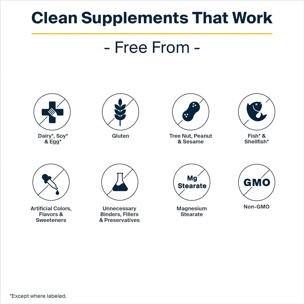 Fórmula vegana limpia: sin gluten, lácteos, maní, frutos secos, pescado, mariscos, soja, sésamo ni huevo. Sin OGM. Elaborado sin rellenos, recubrimientos, aglutinantes ni colorantes artificiales.
