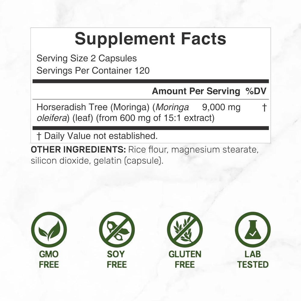 Dosis y porciones: 240 cápsulas de moringa altamente concentradas, 120 porciones que contienen 9000 mg de moringa oleifera de un extracto de hoja de moringa 15:1.