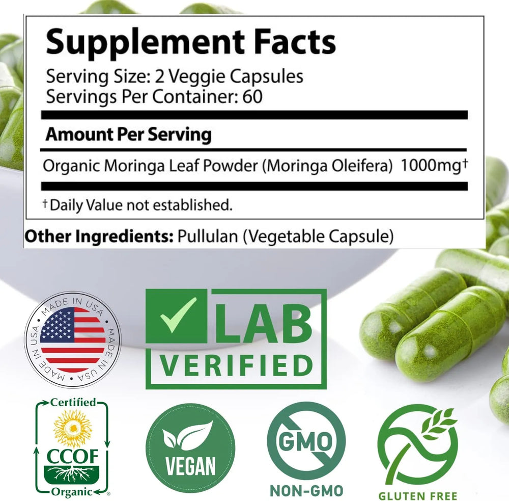 PODEROSO SOPORTE INMUNOLÓGICO: La moringa oleifera es conocida como "el árbol milagroso" debido a sus increíbles beneficios. La moringa es la planta más rica en nutrientes disponible y, a diferencia de cualquier otra planta, es la única planta que contiene los 9 aminoácidos esenciales que son vitales para la salud. Al ser un superalimento rico en nutrientes que contiene una amplia variedad de vitaminas y aminoácidos esenciales, nuestras cápsulas de moringa orgánica funcionan proporcionando antioxidantes para combatir los radicales libres, además de mejorar el bienestar general.