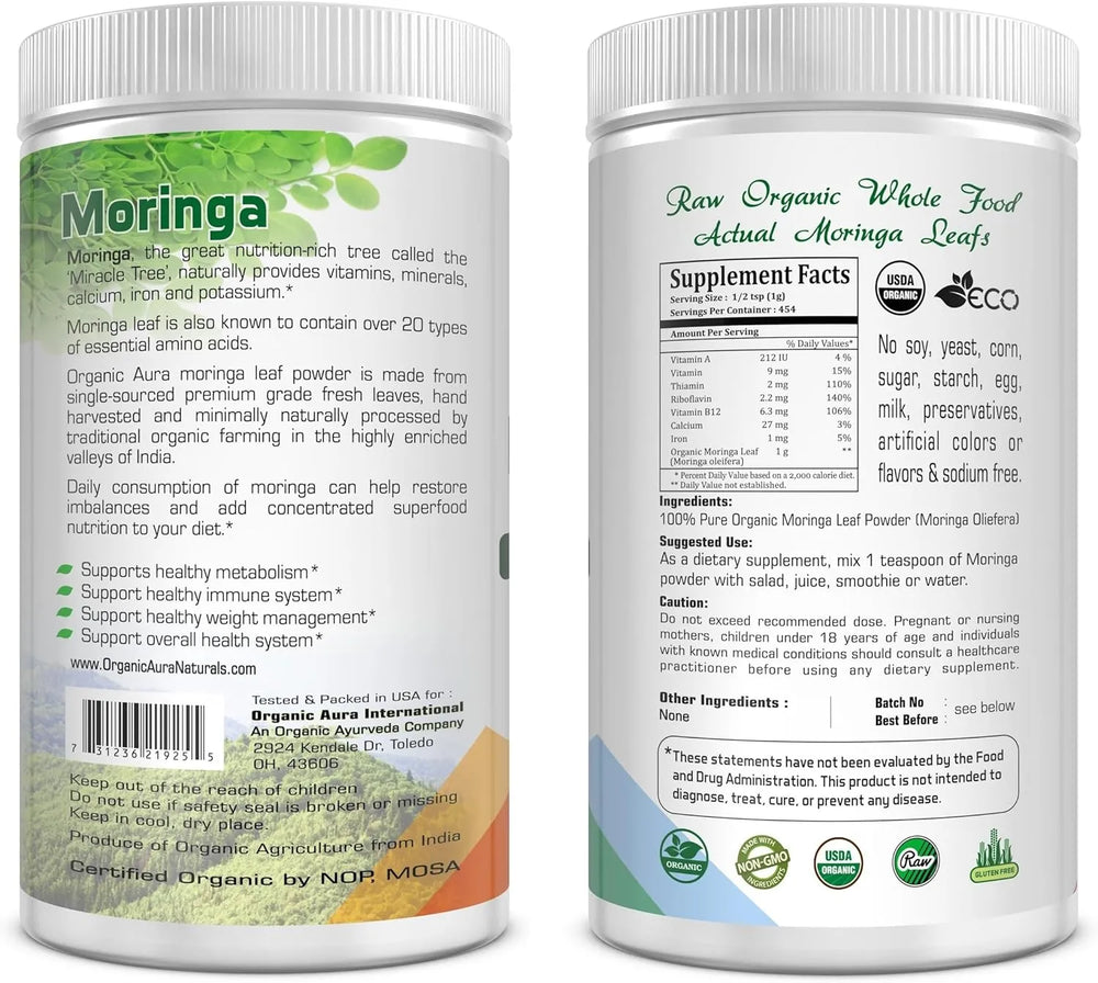 NUTRICIÓN ESENCIAL NATURAL PARA USTED | Sin OGM | Sin gluten | Kosher | Vegano | Orgánico | Súper alimento para batidos y bebidas | UNA SOLUCIÓN VERDADERAMENTE NATURAL. El polvo de moringa orgánico Aura es verdaderamente natural. Nunca agregamos colorantes, sabores, edulcorantes ni conservantes artificiales a nuestros productos, lo que lo convierte en un verdadero remedio natural para quienes desean usar suplementos de moringa para obtener una variedad de beneficios para la salud y aumentar el estado de salud general.