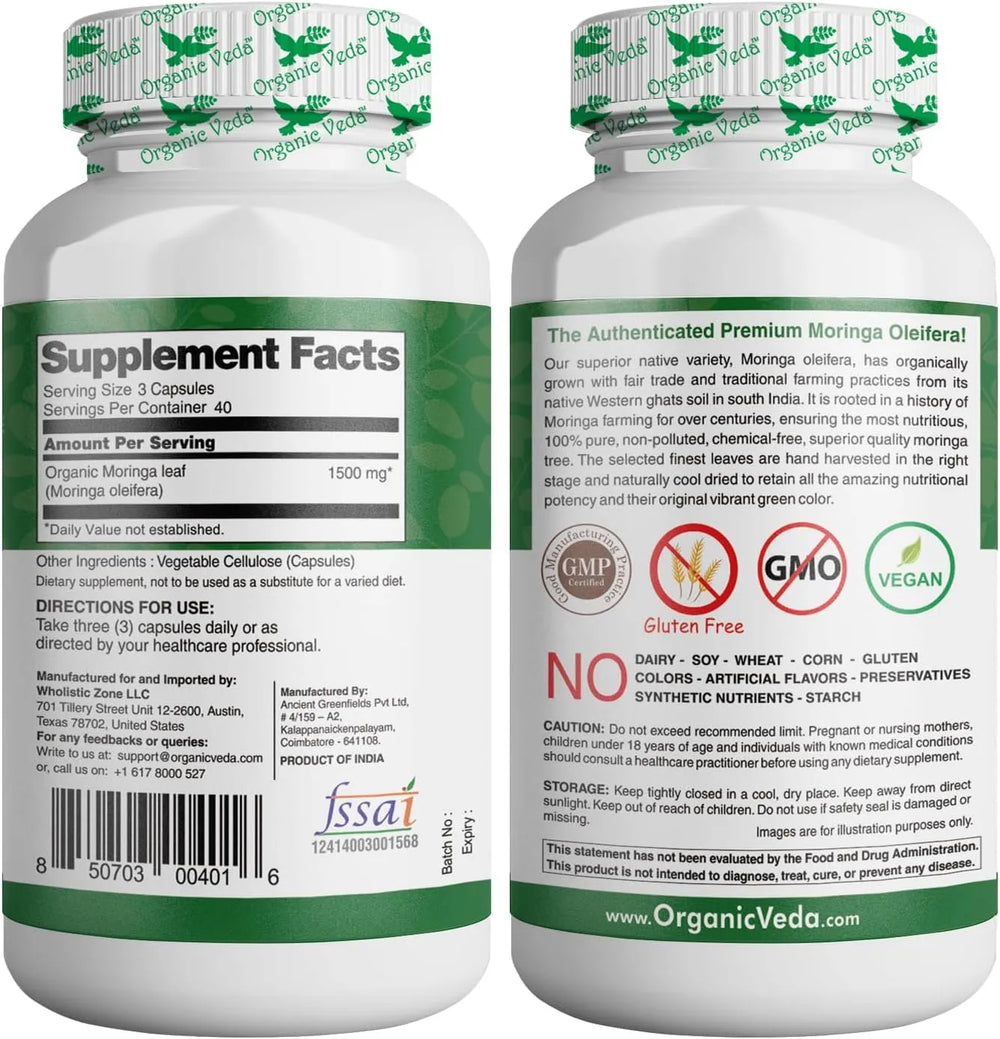 Organic Veda Moringa Leaf 1500Mg. 120 Capsulas