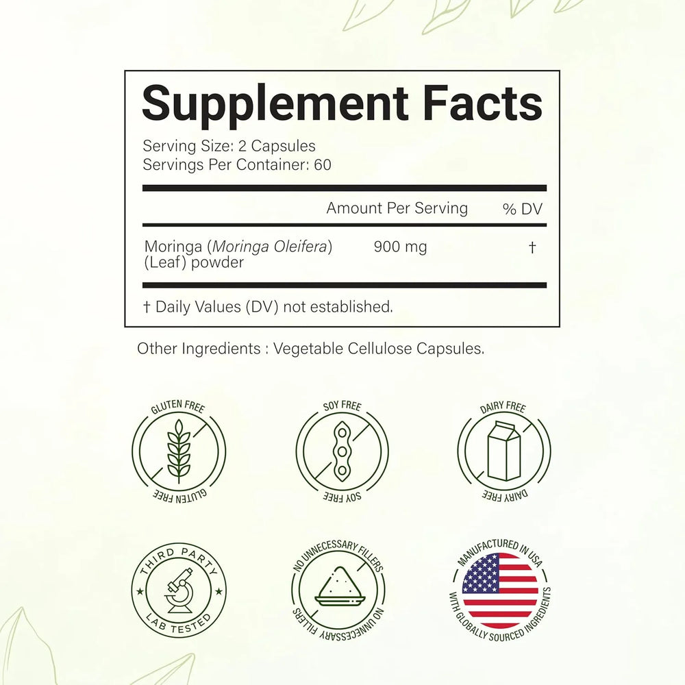 • Cápsulas de moringa pura de alta potencia: las cápsulas de moringa en polvo de Sandhu Herbals aportan 900 mg por ración. Nuestro suplemento de moringa de alta potencia aporta toda la bondad de la planta de moringa y funciona con la misma eficacia que otros suplementos de aceite de moringa o pastillas de moringa habituales del mercado.