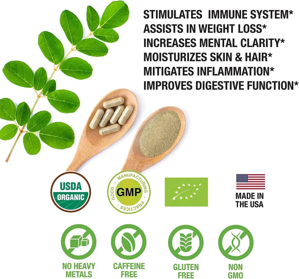 NUESTRAS CÁPSULAS DE POLVO DE MORINGA 100% CRUDO Y PURO SON ORGÁNICAS CERTIFICADAS: sin cafeína, sin gluten, sin OGM, sin metales pesados y con certificación orgánica USDA.