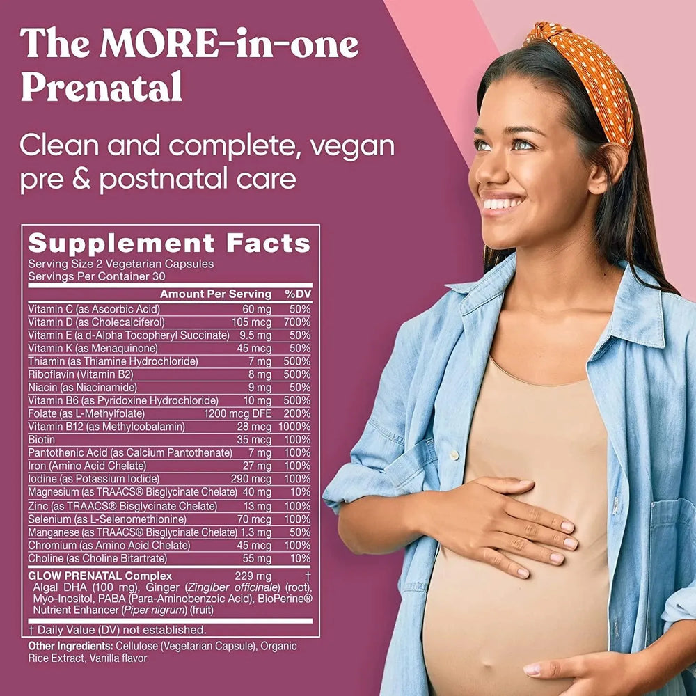 Todo lo que necesita, nada que no necesite: las cápsulas multivitamínicas Prenatal Glow contienen una mezcla certificada por cGMP; completamente libre de crueldad sin rellenos, aglutinantes, ingredientes artificiales, gluten o trigo para un apoyo limpio durante el embarazo