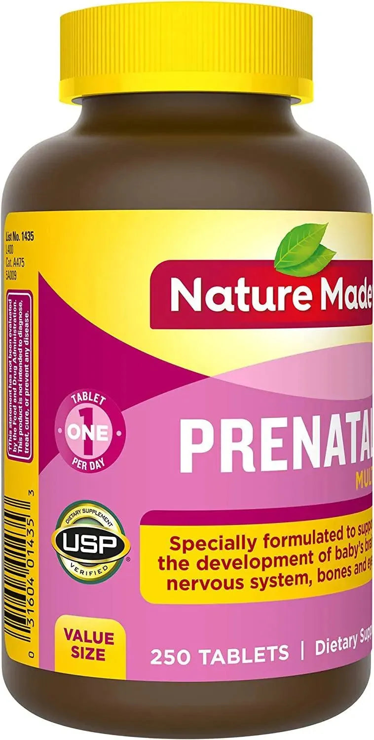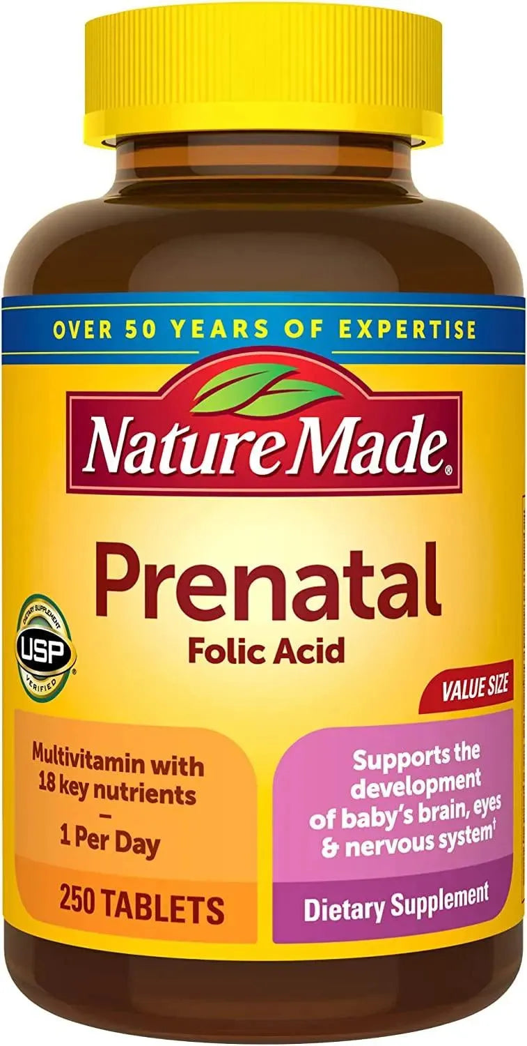 Suplemento de apoyo nutricional prenatal: contiene una botella de 250 unidades de Nature Made Prenatal Multivitamin with Folic Acid Tablets para un suministro de 250 días