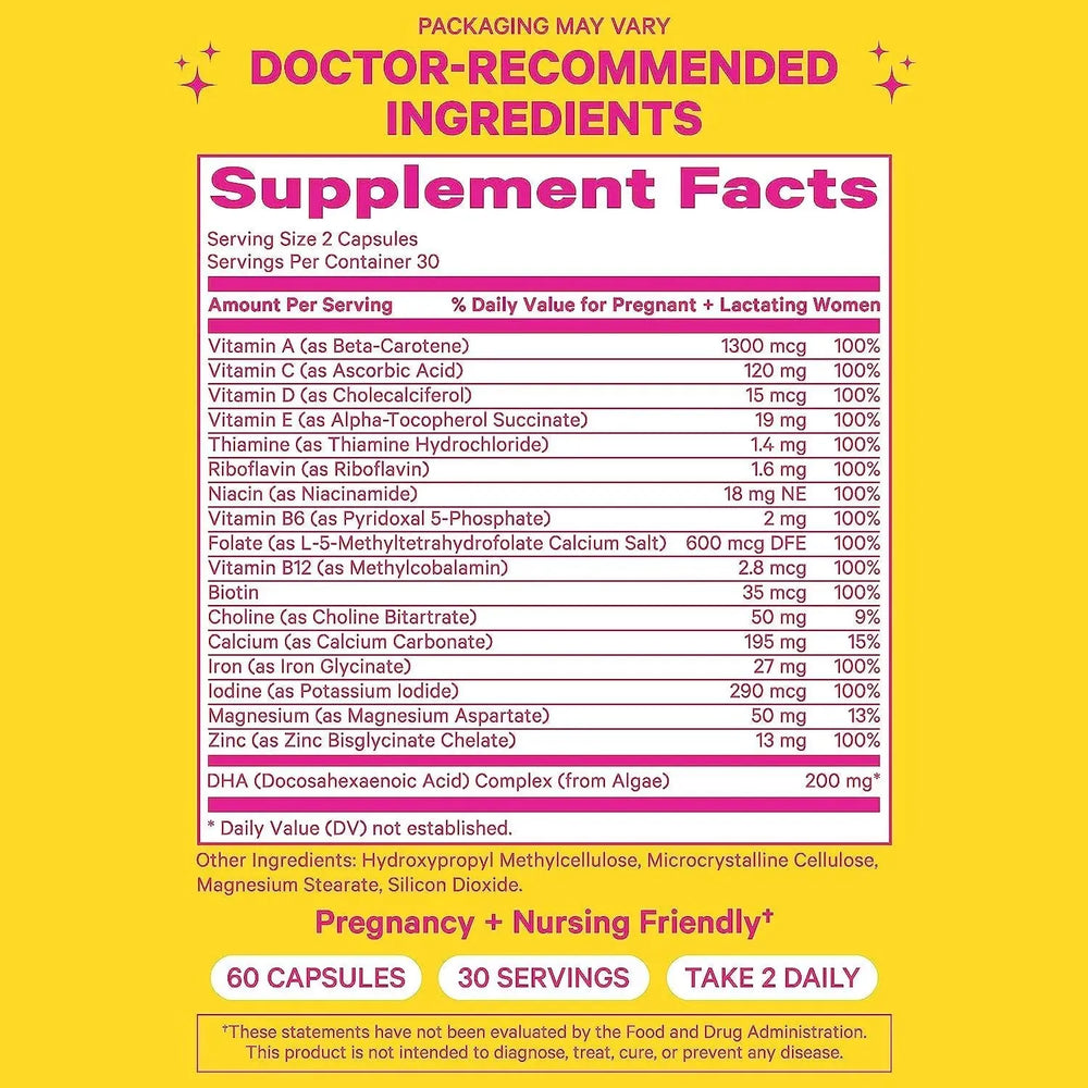 Pink Stork Total Prenatal Vitamins with DHA, Choline, Folate, Iron, and Vitamin B12 60 Capsulas