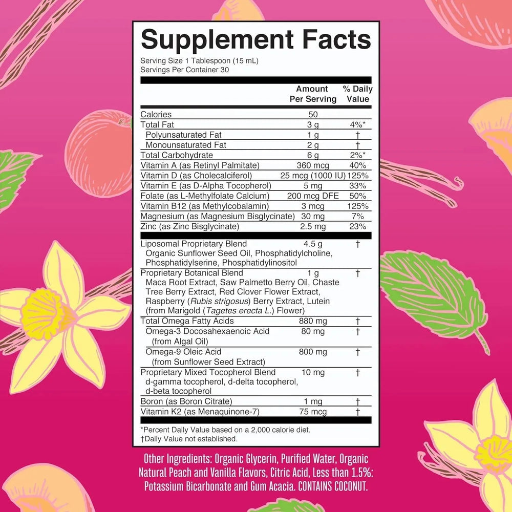 Multivitamina líquida para mujeres: el metil B12 respalda los niveles de energía y ayuda en el metabolismo de los aminoácidos, mientras que el metilfolato (vitamina B9) ayuda a la formación de glóbulos rojos y blancos, al crecimiento celular y a la división celular adecuada. Omega-3 como DHA y omega-9 apoyan la salud cognitiva, la salud cardiovascular y la salud inmunológica.