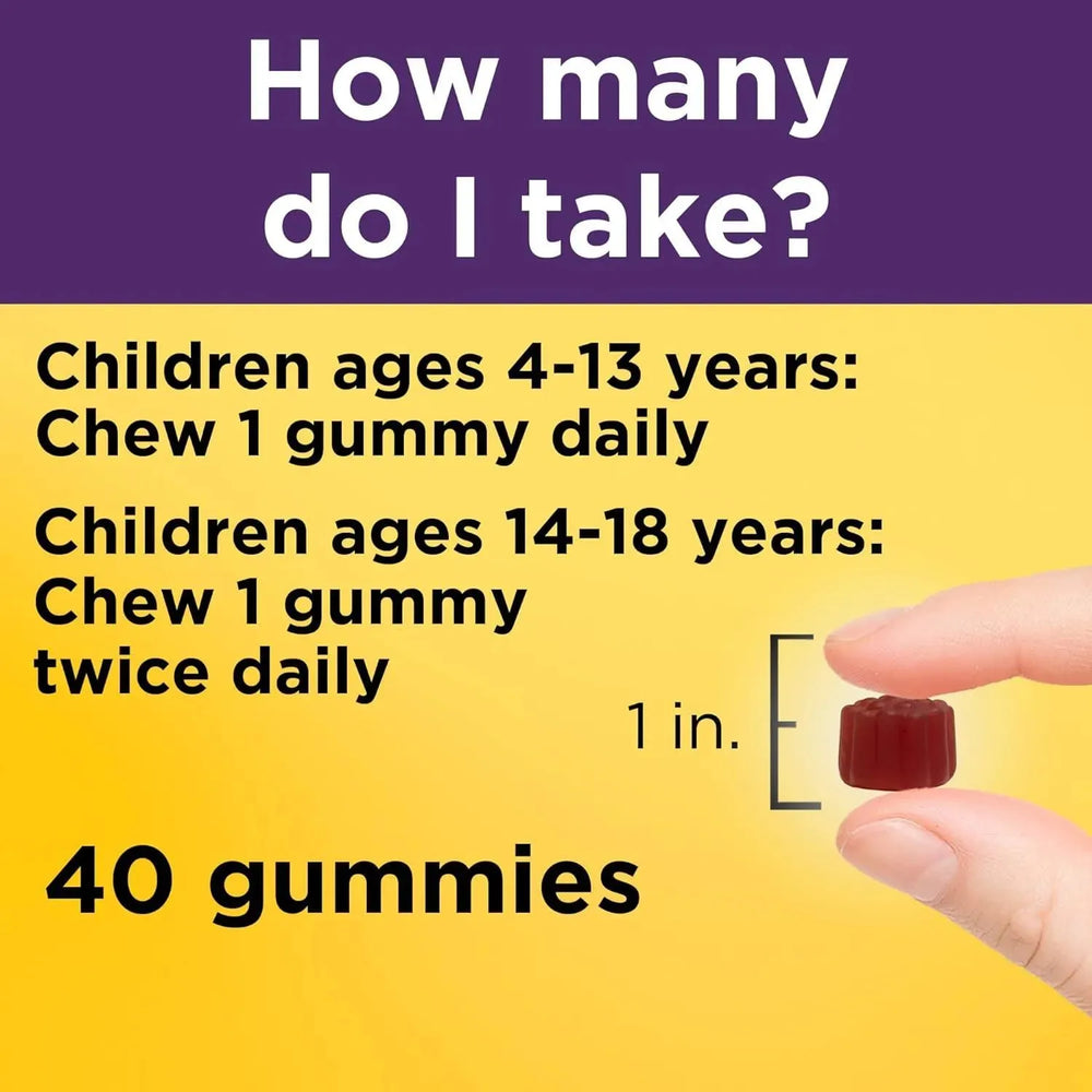 Los niños de 4 a 13 años deben masticar 1 gomita de saúco para niños al día; niños de 14 a 18 años, mastiquen 1 gomita de saúco dos veces al día