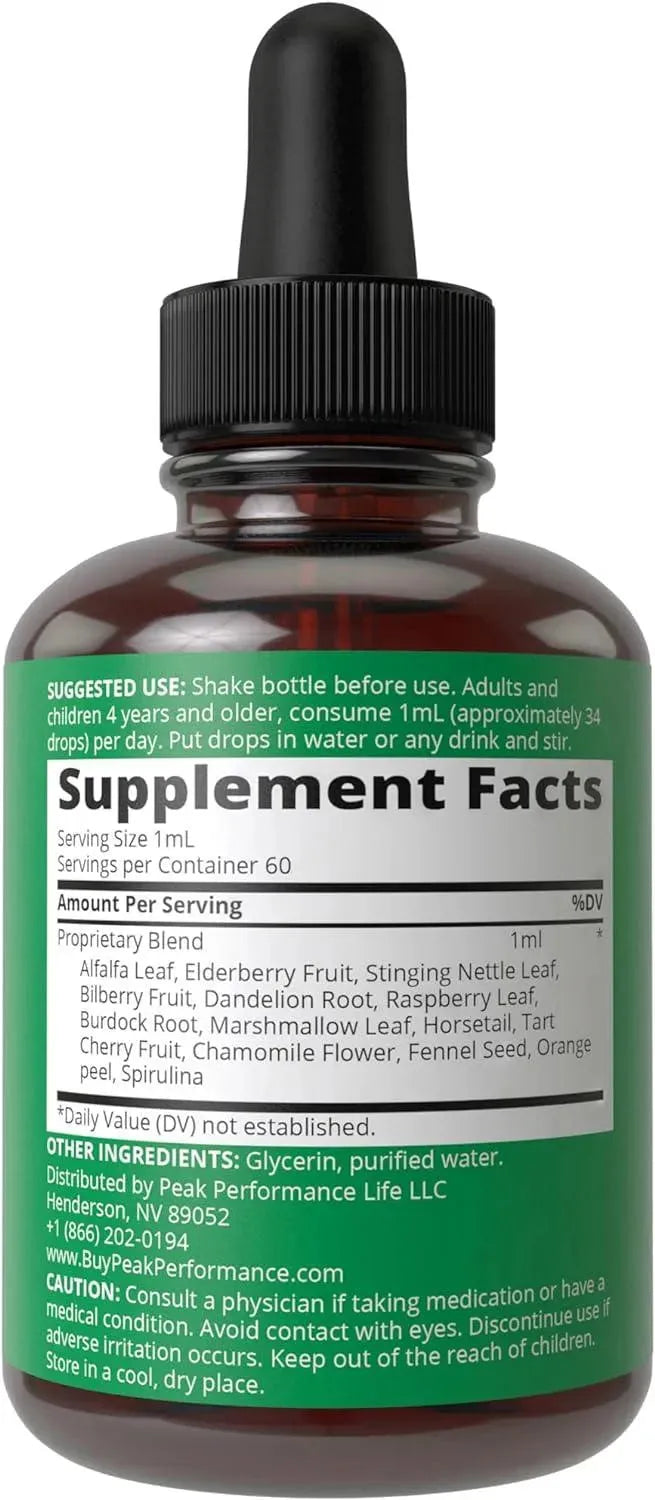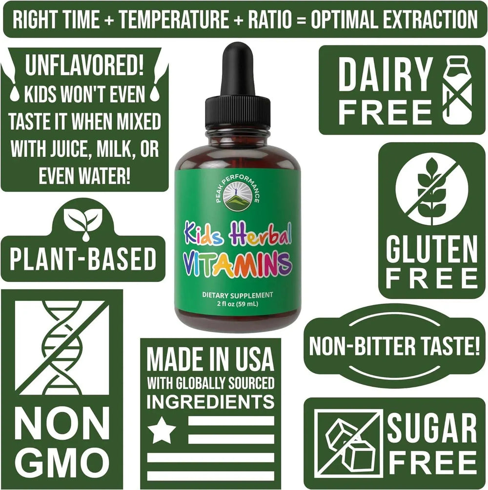 Sin sabor, insípido, de alta potencia y máxima absorción: su hijo ahora puede acceder a muchos de los nutrientes vitales que necesita sin el sabor amargo. ¡Simplemente mezcle estas gotas con jugo, leche o incluso agua y su hijo ni siquiera las probará! Las vitaminas líquidas Peak Performance Kids son un suplemento elaborado naturalmente con 14 ingredientes, que incluyen: hoja de alfalfa, fruta de saúco, hoja de ortiga, fruta de arándano, raíz de diente de león, hoja de frambuesa, raíz de bardana, hoja de malvavisco y más.