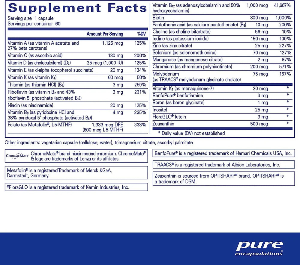 Multivitamínico para variaciones genéticas: estos suplementos multivitamínicos de Pure Encapsulations para mujeres y hombres contienen antioxidantes para la salud de los ojos y el cerebro.