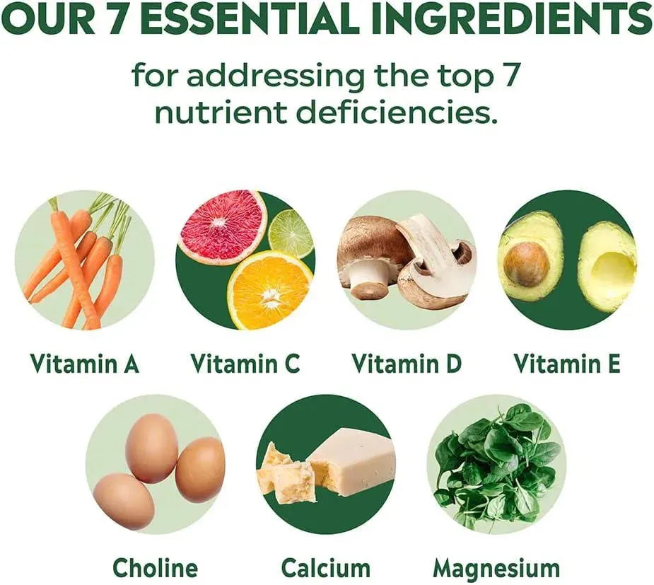 • AYUDA A ABORDAR LAS 7 DEFICIENCIAS PRINCIPALES: En lugar de consumir un exceso de suplementos y vitaminas para la inmunidad, nuestra fórmula cierra la brecha en las 7 deficiencias de nutrientes principales en los adultos, incluidas la vitamina E, la vitamina A (betacaroteno), la vitamina D, la vitamina C, el magnesio, Colina y Calcio. Más del 40% de los adultos en los EE. UU. no obtienen suficientes nutrientes de su dieta únicamente.