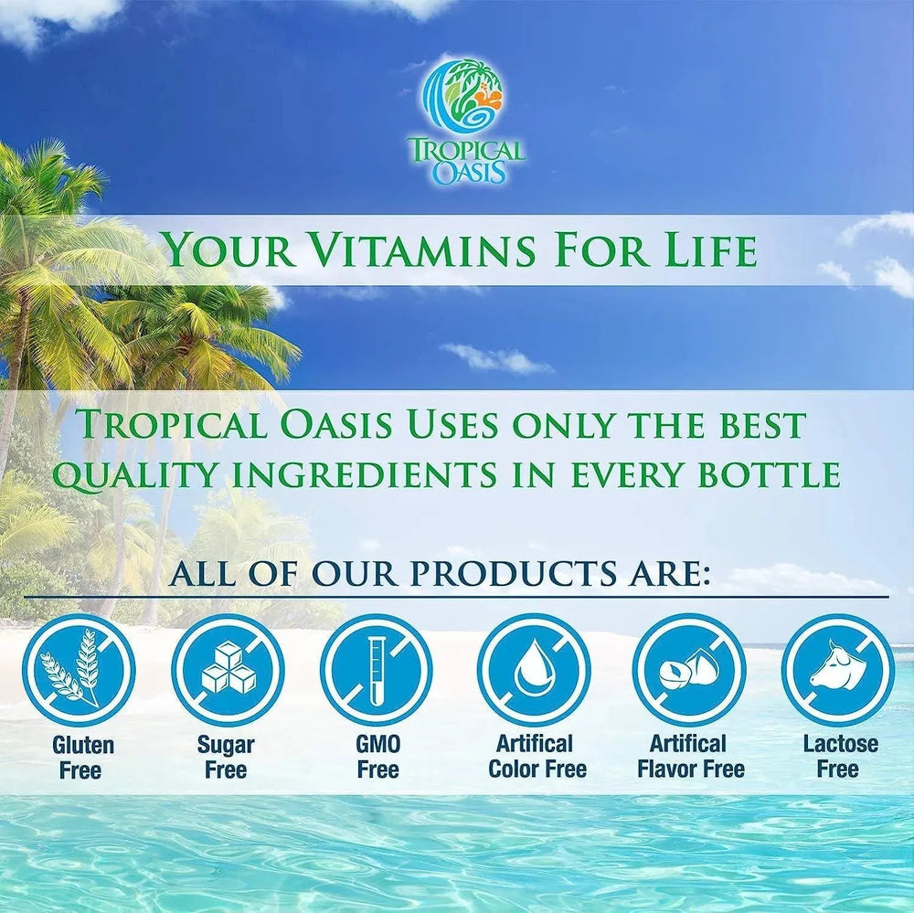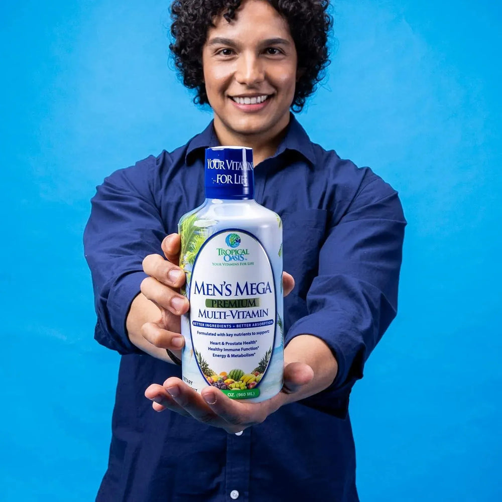 • Tropical Oasis New Men's Mega Liquid Multivitamin está especialmente formulado para hombres con vitaminas, minerales, hierbas, aminoácidos y nutrientes de primera calidad que lo mantendrán sintiéndose joven y viviendo un estilo de vida activo.