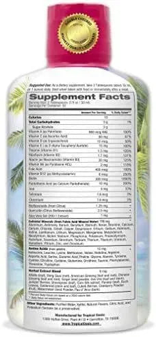 FÓRMULA PREMIUM CON UNA MEZCLA DE 16 HIERBAS Y SUPERALIMENTOS: Tropical Oasis Women's Premium Liquid Multivitamin está especialmente formulado para mujeres con vitaminas, minerales, hierbas y superalimentos de primera calidad que te mantendrán sintiéndote joven y viviendo un estilo de vida activo.