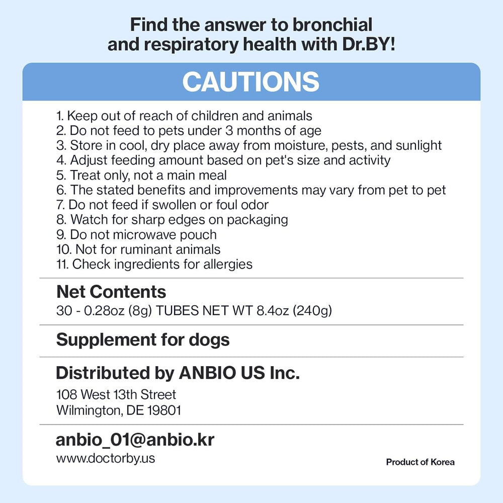 Apoyo para la salud bronquial y respiratoria] Desarrollamos Dr.BY Breath Care, enfocándonos en mejorar la salud bronquial y respiratoria de los perros. Este producto contiene TF-343, magnesio, propóleo, quitosano y clorella.