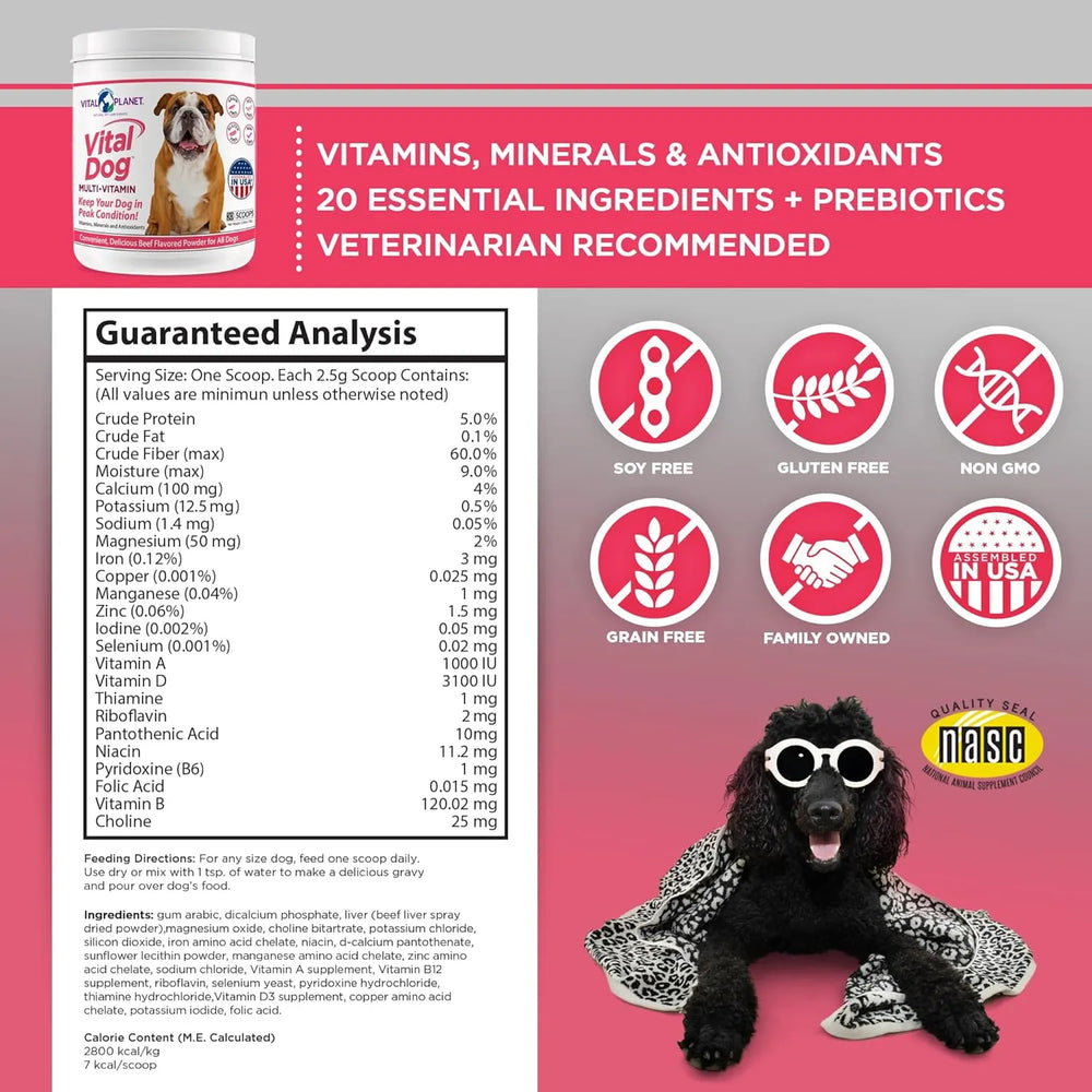 Apoyo integral para todo el cuerpo: Vital Dog es una mezcla sinérgica y natural formulada con 20 ingredientes saludables para la salud y el bienestar general. Este suplemento multivitamínico con prebióticos, formulado y recomendado por veterinarios, ayuda a proporcionar nutrientes para un cuerpo sano y favorece niveles normales de energía.