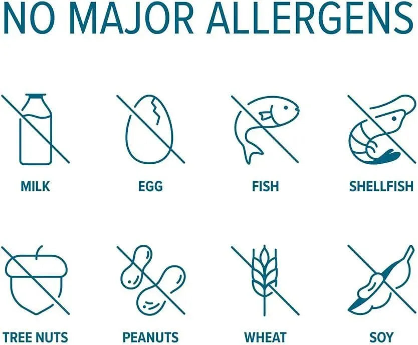 • Libre de: Huevos, pescado, gluten, OGM, leche, maní, mariscos, soja, sésamo, nueces, trigo, colorantes artificiales, saborizantes artificiales y conservantes artificiales.