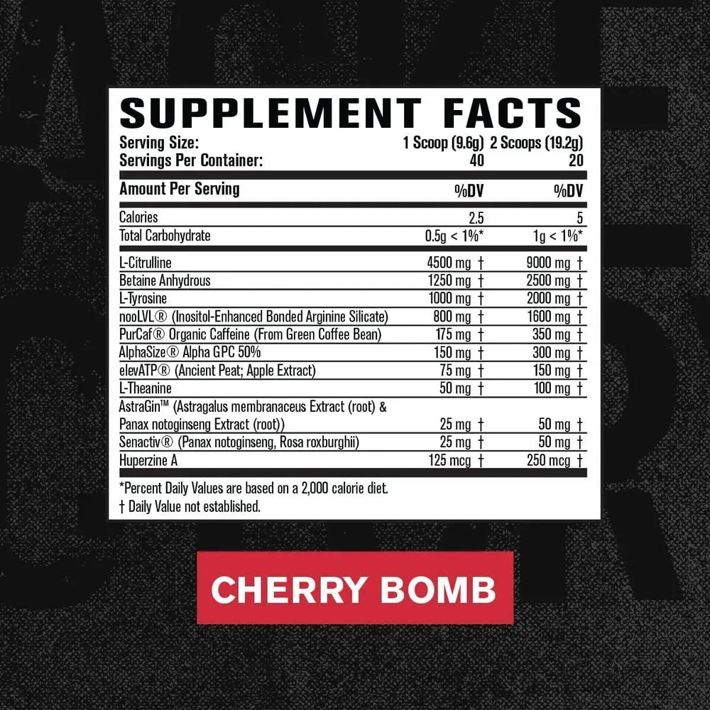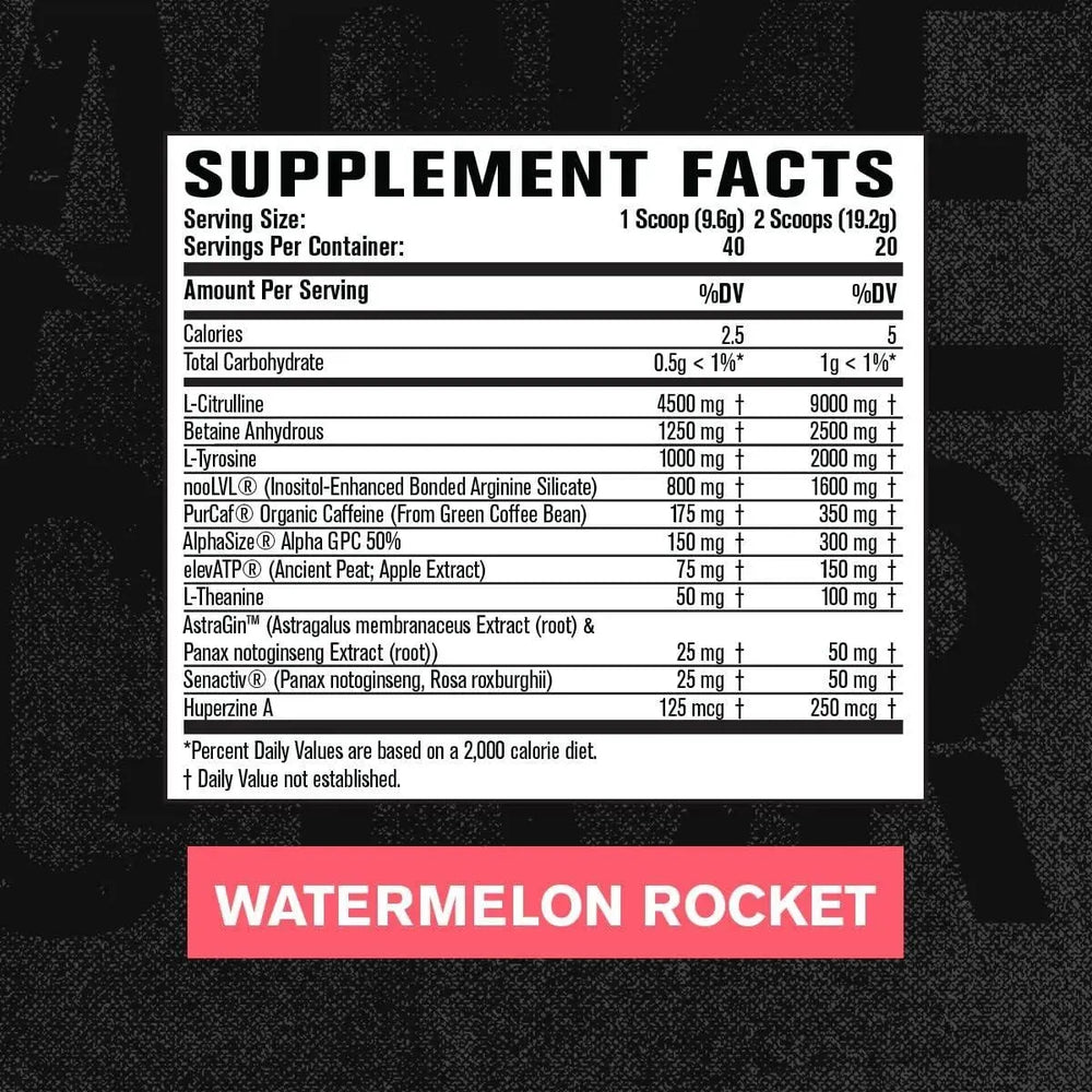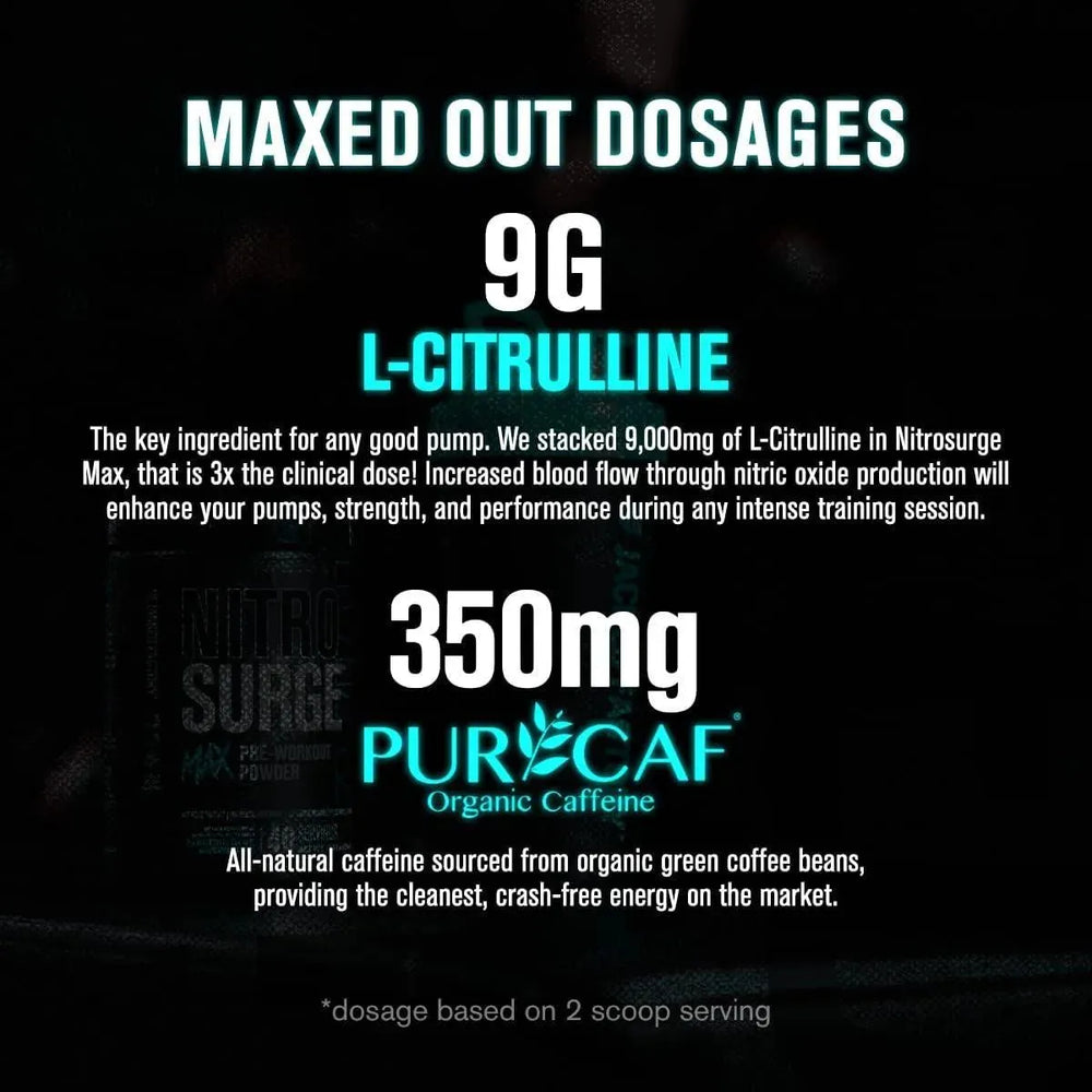 • Llevando Nitrosurge al siguiente nivel: si ya disfrutas de nuestra fórmula Nitrosurge más vendida, Nitrosurge Max es el siguiente nivel para que puedas mejorar tu juego previo al entrenamiento con una concentración intensa. Cuenta con ingredientes de marca registrada premium que incluyen NooLVL, PurCaf Organic Caffeine, AlphaSize Alpha GPC, elevATP, Astragin y Senactiv. También contiene 9 g de L-citrulina líder en la industria en una porción completa.