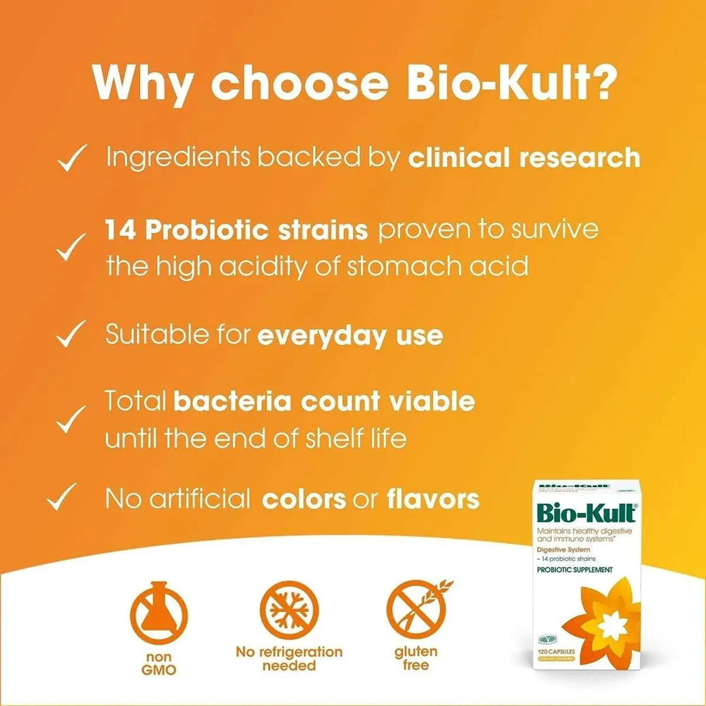 • Bio-Kult contiene 14 cepas probióticas para complementar la flora intestinal existente presente de forma natural en el sistema digestivo de una persona sana.