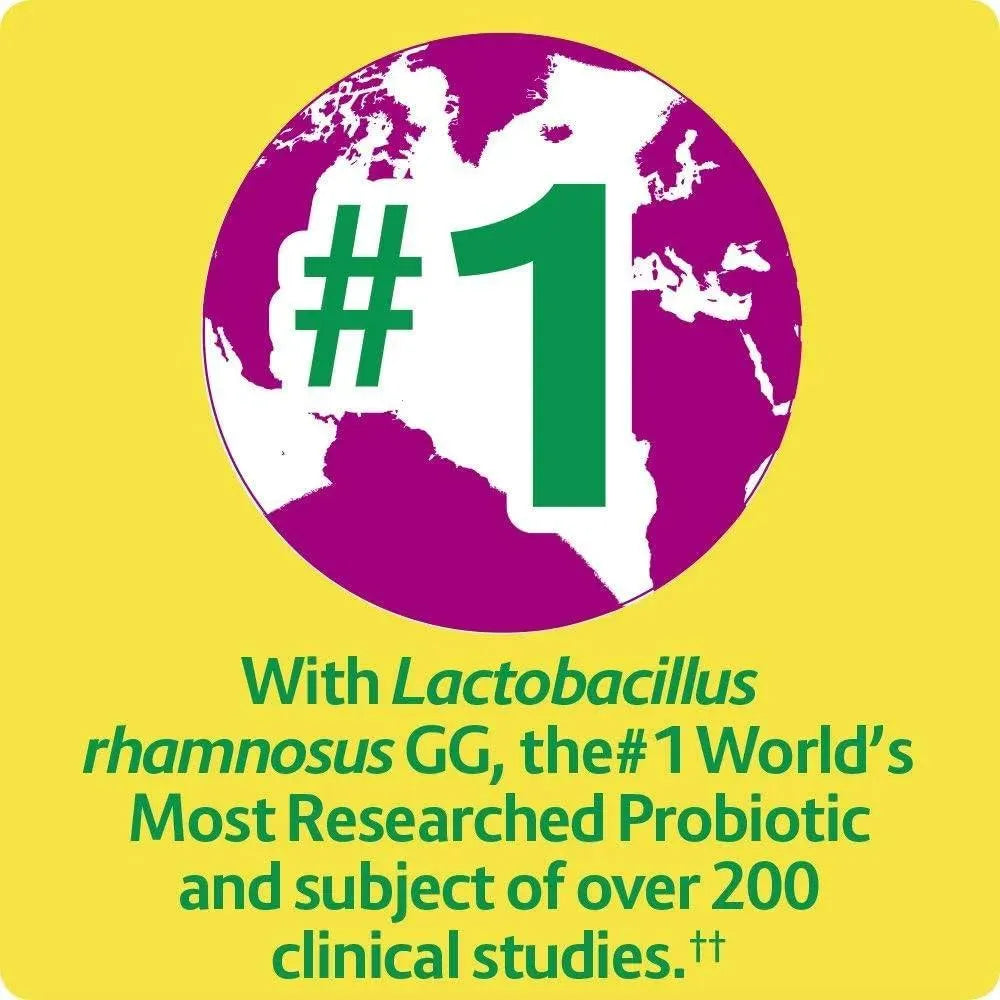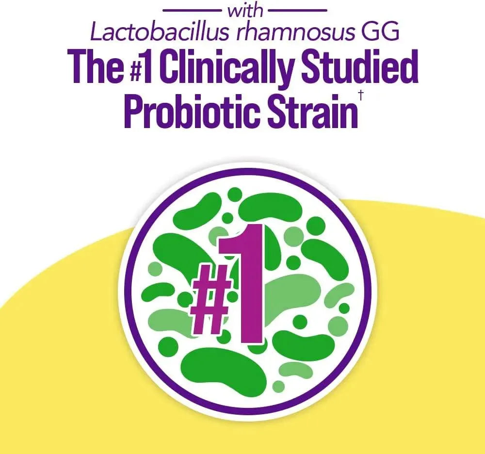 PROBIÓTICOS: 10 mil millones de cultivos activos vivos de Lactobacillus rhamnosus GG (LGG), el probiótico clínicamente estudiado, ayuda a restaurar el equilibrio natural de las bacterias buenas en el tracto digestivo.