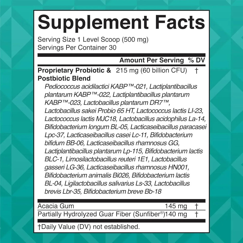 • Fórmula vegana: mezcla patentada de probióticos y posbióticos (60 mil millones de UFC), goma de acacia, fibra de guar parcialmente hidrolizada (fibra solar)