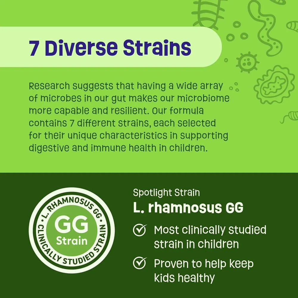 Para mayores de 4 años: el apoyo que sus hijos necesitan: con 5 mil millones de UFC, 7 cepas diversas, prebióticos orgánicos, vitaminas y minerales para respaldar la salud digestiva e inmunológica. Apoye el bioma intestinal de su hijo con nuestra tableta masticable con sabor a bayas.