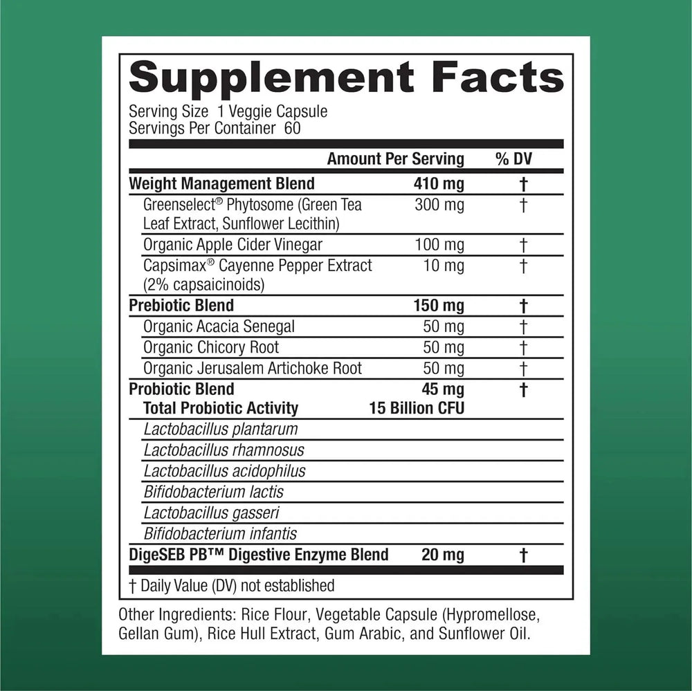 • Apoya la salud y el equilibrio digestivo: un probiótico diario y un prebiótico orgánico con enzimas digestivas para promover la salud y el equilibrio intestinal. Estas cepas actúan juntas para apoyar la salud intestinal. Nuestra fórmula contiene Capsimax para ayudar a promover el control del peso.