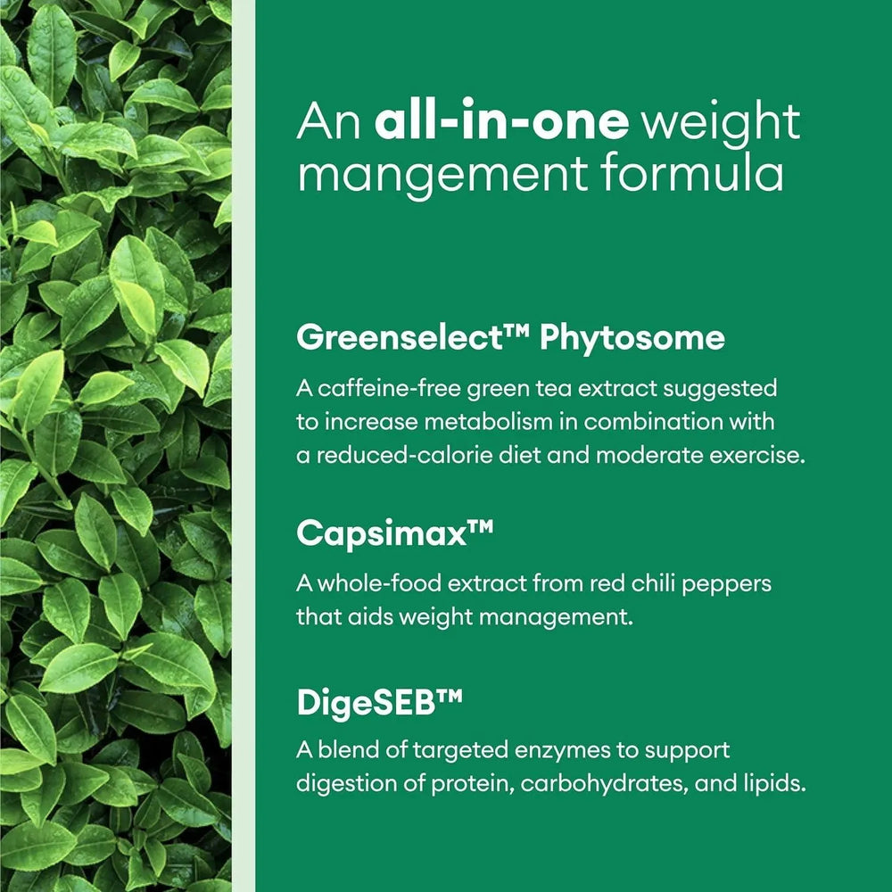 • Apoya el control del peso: en un estudio clínico, 100 pacientes perdieron un promedio de más de 30 libras. en 90 días tomando 300 mg de Greenselect Phytosome sin estimulantes al día con una dieta baja en calorías y ejercicio. Greenselect es un extracto de té verde sin cafeína.