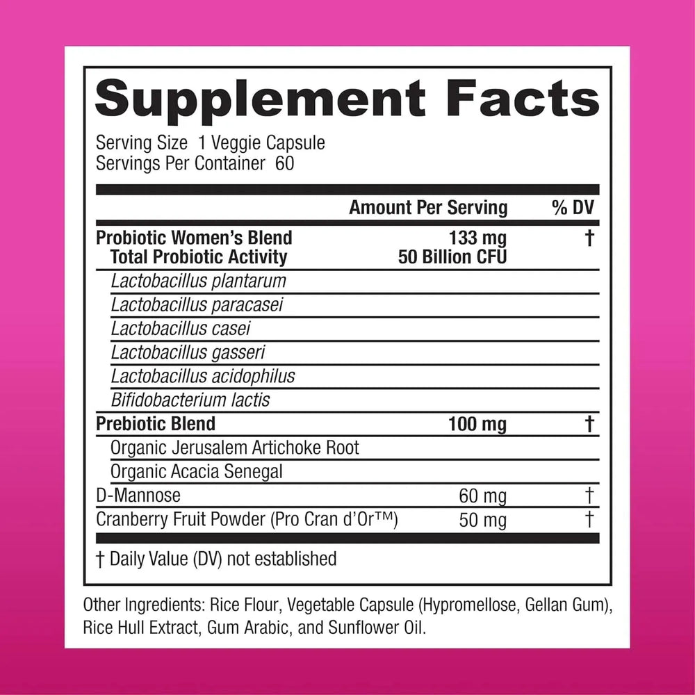 Probióticos una vez al día para mujeres: nuestro probiótico está diseñado específicamente para la salud femenina y la salud digestiva general. 6 cepas diversas (50 mil millones de UFC), D-Manosa, Pro-Cran y prebióticos orgánicos le brindan el apoyo femenino que se merece.