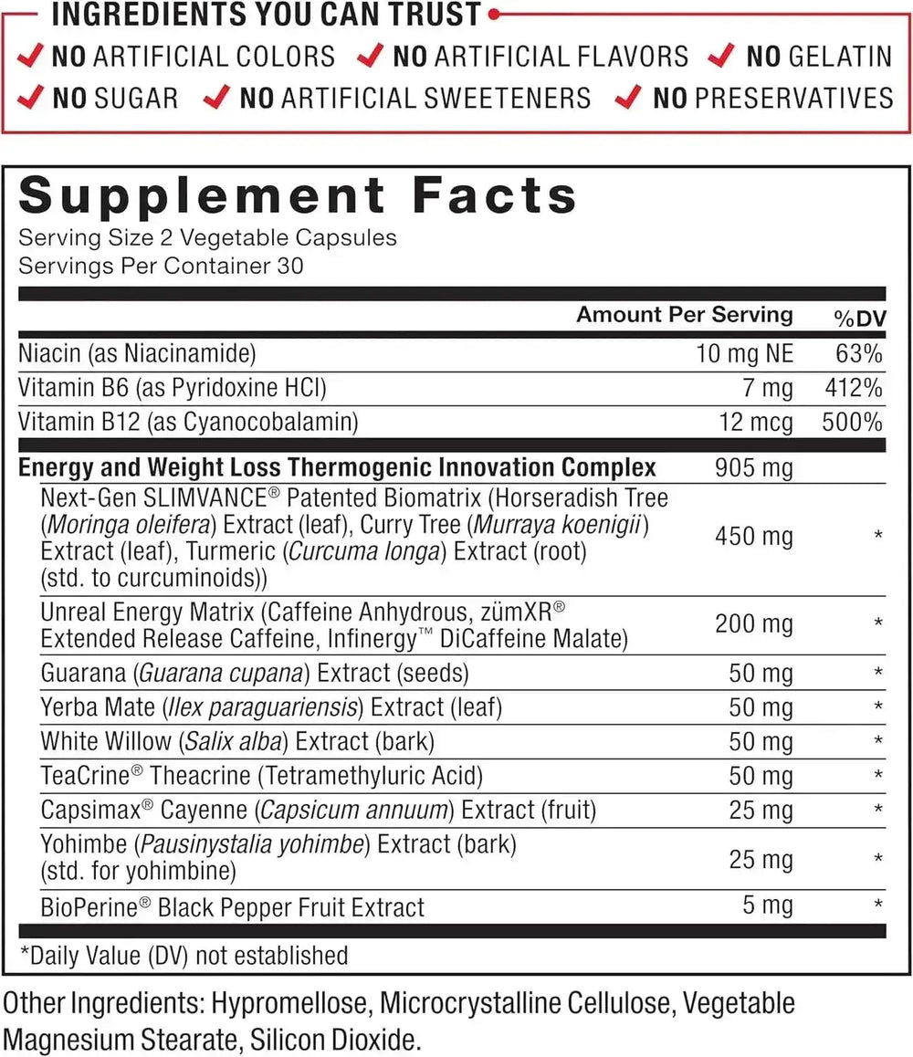 ENERGÍA AMPLIADA PARA QUEMAR GRASA ENÉRGICAMENTE: Aumentar la energía directamente te ayuda a combatir la fatiga y mantener la concentración, al mismo tiempo que promueve la termogénesis. Los ingredientes de marca premium como Infinergy, zümXR, TeaCrine theacrine y Capsimax ayudan a elevar los niveles de energía durante el día, activar la termogénesis, suprimir el apetito y mejorar la concentración y el estado de ánimo.