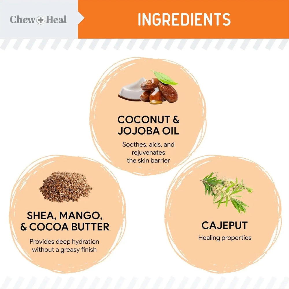 • Cuidado Calmante para las Patas: El bálsamo Paw Support de Chew + Heal ofrece una solución nutritiva y protectora para las patas de tu perro. Enriquecido con manteca de karité y vitamina E, hidrata y protege contra superficies ásperas, asegurando que las patas de tu perro se mantengan sanas.