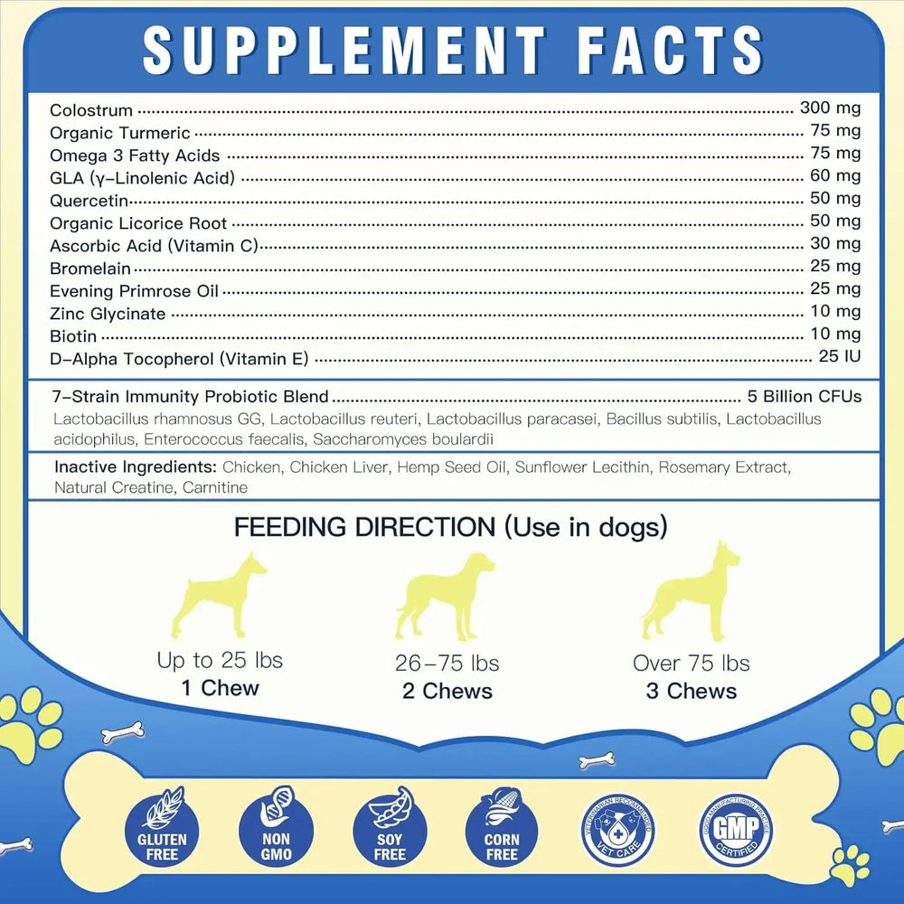 • Fortalece el sistema inmunitario: Nuestro medicamento para la alergia canina utiliza calostro y probióticos especiales que favorecen la salud intestinal, inmunitaria y cutánea. Refuerza la barrera cutánea contra irritantes y acelera la cicatrización durante todo el año, no solo para la alergia estacional.
