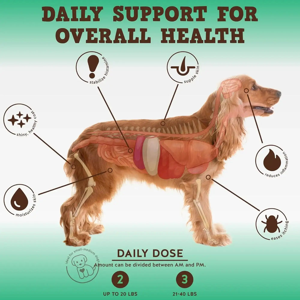 • Salud de la piel y el pelaje: Dile adiós a la picazón y la descamación de la piel y el pelaje. Estos suplementos antipicazón para perros, que combaten las picaduras y la picazón de la piel, además del suplemento para el pelaje, contienen omega 3 (provenientes del pescado) para hidratar y aliviar la picazón en la piel de tu perro. El polvo de calabaza, que contiene vitaminas A y zinc, hidrata y acondiciona la piel y el pelaje para reducir la sequedad y la descamación y hacerlo brillante, fuerte, flexible y saludable; además de fortalecer el sistema inmunológico.