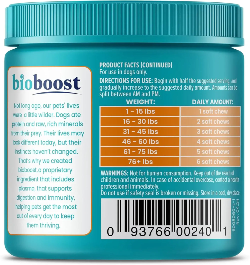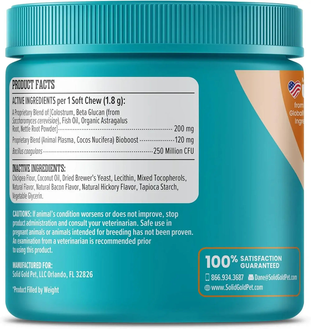 Equilibrio digestivo y de histamina: Cada masticable incluye probióticos, calostro y astrágalo para promover una digestión saludable y complementar las necesidades de medicamentos para la alergia canina, equilibrando la histamina y reduciendo los brotes. Un excelente suplemento para la piel y el pelaje de perros de todas las edades.