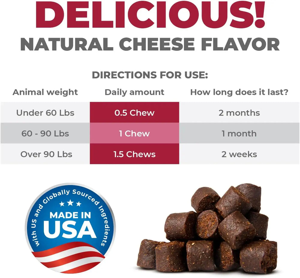 10/10 ¡A los perros les encanta el sabor!*: Deliciosos masticables fáciles de tomar. Formulado específicamente para perros: apoyo seguro y eficaz para perros de todos los tamaños, con una recomendación de dosis basada en el peso, con una duración de hasta 2 meses (*basado en un estudio independiente. Los resultados individuales pueden variar).