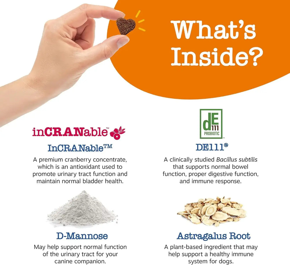 Con InCRANable: Cada masticable contiene concentrado de arándano rojo premium, un antioxidante utilizado para promover la función del tracto urinario y mantener el control de la vejiga en perros.