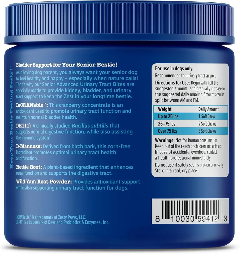 Apoyo para el tracto urinario: Urary Tract Bites son vitaminas para perros mayores, repletas de ingredientes que brindan apoyo renal, vesical y inmunológico a perros de todas las edades.