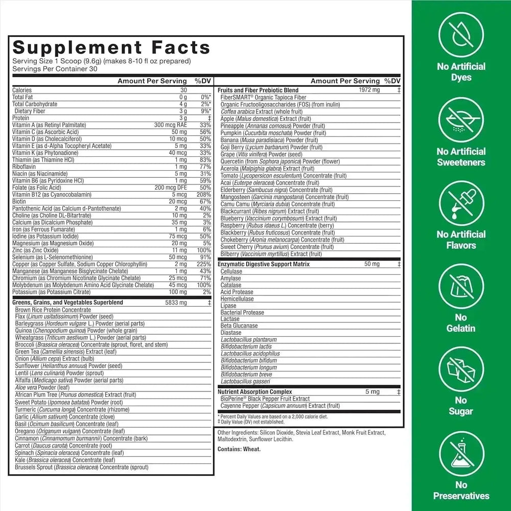 REPLETO DE 37 FRUTAS, VERDURAS Y SUPERALIMENTOS: Experimente una mejor energía y vitalidad con vitaminas y minerales esenciales de más de 40 ingredientes superalimenticios como col rizada, brócoli, espinaca, pasto de trigo, bayas, cúrcuma y más.